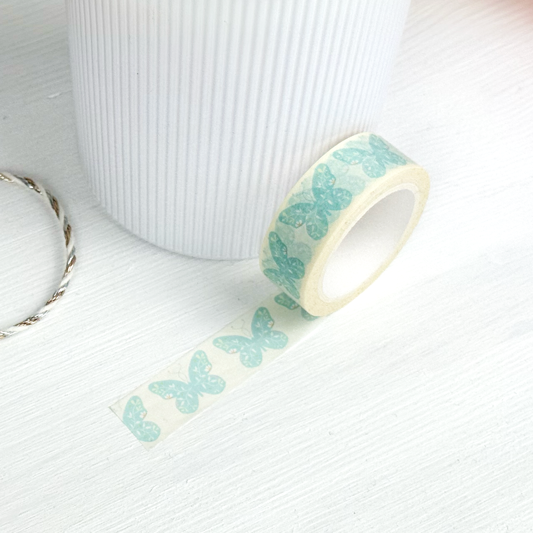 Taśma washi w turkusowe motyle, wykonana z cienkiego papieru. Idealna do pakowania prezentów, przyklejania notatek w planerze lub dekorowania ściany.